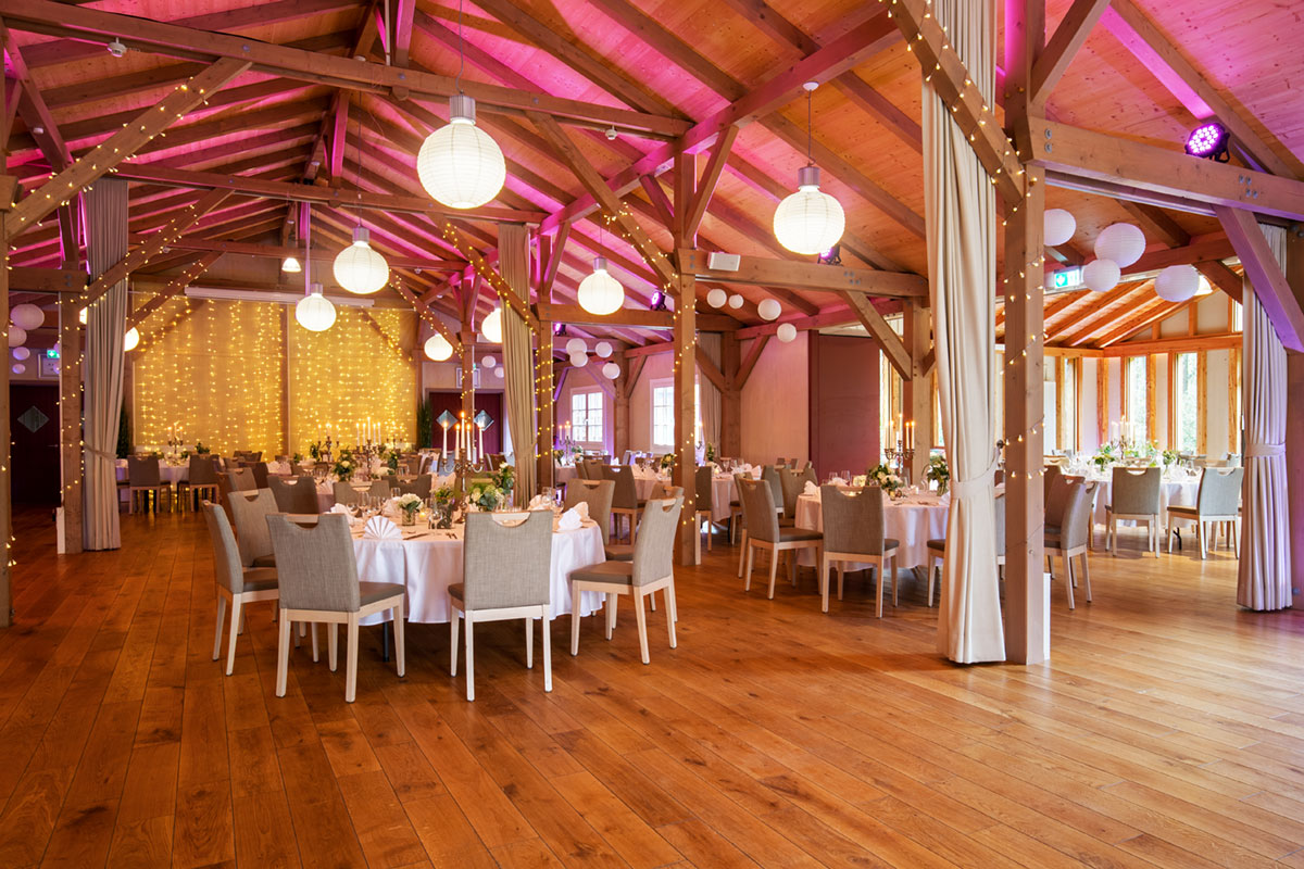 Je nach Jahreszeit empfängt das Hotel Heidegrund die Gäste mit einem sommerlichen Aperitif im Garten-Pavillon oder mit einem Glühwein im Winter am offenen Kamin. Bei gutem Wetter ist eine Trauung auch unter freiem Himmel möglich. Anschließend nehmen die Gäste in der liebevoll gedeckten Holzscheune unter beleuchteten Lampions Platz und feiern ungestört bis in den Morgen. Und der Weg ins gemütliche Bett ist abends nicht mehr weit. Im Scheunengebäude finden Sie einen separaten Buffetraum sowie gemütliche Nischen für Tanzflächen, Loungebereiche oder einen Bühnenbereich. Unser Team versorgt Ihre Gäste an zwei vollausgestatteten Bartheken mit Getränken jeglicher Art. Lampions, Lichterketten, verstellbare RGB-Leuchten sowie eine Musikanlage sind bereits verbaut und schaffen eine festliche Atmosphäre.