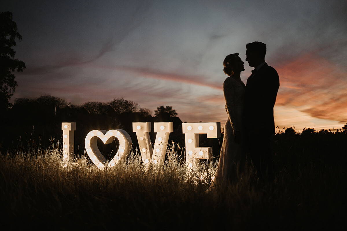 Der schönste Tag in Eurem Leben soll ganz besonders in Erinnerung bleiben? Eure Gäste werdet ihr mit den 3D-Leuchtbuchstaben in Staunen versetzten: Die 1 Meter hohen Buchstaben werden mit LED-Birnen in Retro-Optik beleuchtet. Sowohl bei Tageslicht beim Fotoshooting oder der freien Trauung im Park, als auch im Dunkeln auf der Tanzfläche oder hinter Eurem Brauttisch schaffen die Riesen-Leuchtbuchstaben einen außergwöhnlichen Hingucker! Die XXL-Leuchtbuchstaben "LOVE" oder "L♥VE" sind so individuell einsetzbar, wie auch Eure Feier wird: Die Buchstaben stehen frei, erstrahlen in Wunschfarbe und werden mit unserem LieferLuxus-Paket ganz genau dort aufgebaut, wo Ihr sie haben möchtet.