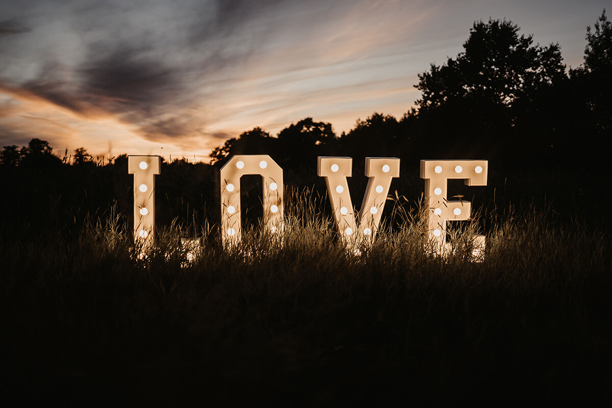 Für unsere Buchstaben benötigt Ihr mindestens 3,5 Meter Stellfläche. Wir haben eine Indoor- und eine regenfeste Outdoor-Ausgabe der Buchstaben zur Verfügung. Wir lieben Service, darum bekommt Ihr bei uns bekommt das Rundum-Sorglos-Paket: An Eurem großen Tag habt Ihr besseres zu tun, als Euch um Fahrerei, Transport, Aufbau und Verkabelung der Leuchtbuchstaben zu kümmern. Darum bieten wir Euch unseren Rundum-Sorglos-Service: Wir besprechen vorher alle Details und liefern dann zuverlässig und pünktlich an Euren Wunschort. Wir bauen auf, verkabeln und bauen am nächsten Tag wieder ab. Ihr müsst Euch um nichts kümmern und könnt Euch ganz und gar Eurem Tag widmen!