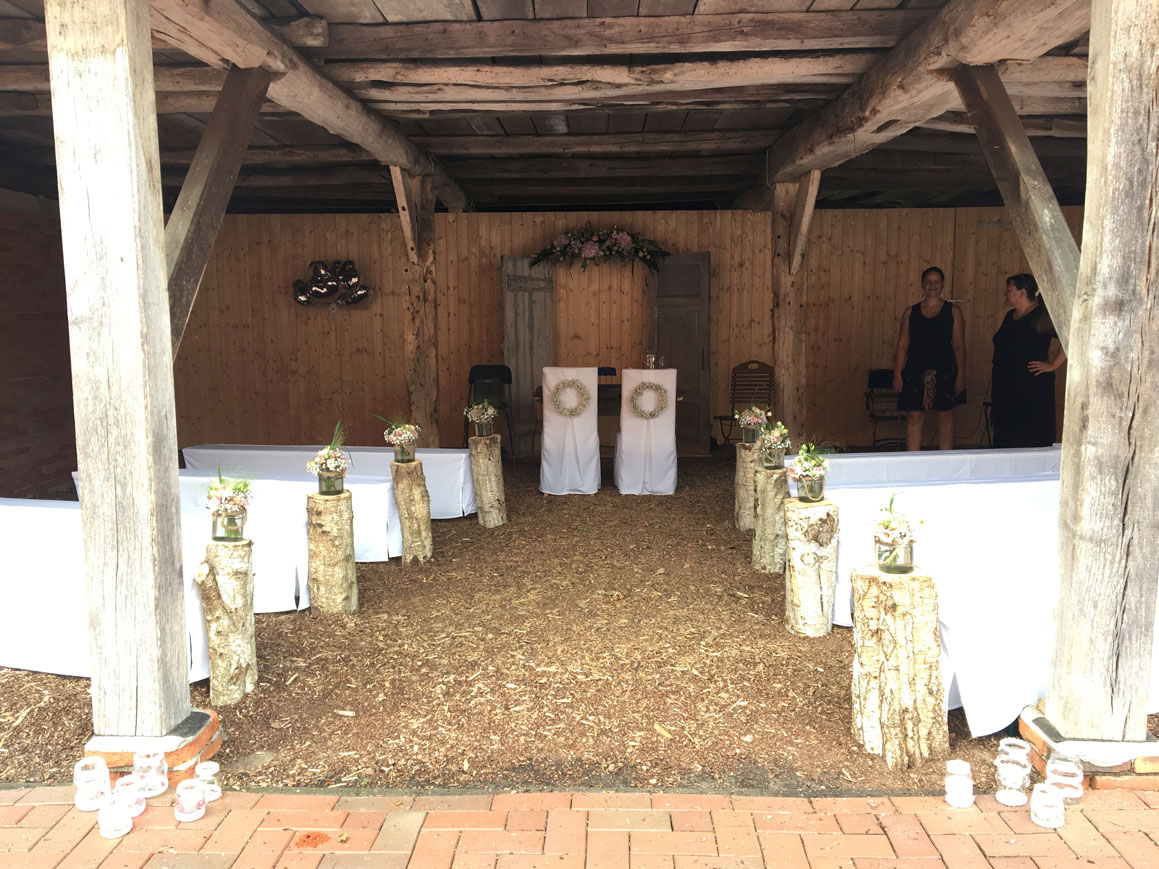 Der großzügige Vorraum eignet sich hervorragend für das Büffet und unter dem Schleppdach im Innenhof kann wetterunabhängig gegrillt werden. Die Remise lädt in lauschigen Sommernächten zum Verweilen ein und kann bei schlechtem Wetter als Alternative für eine freie Trauung genutzt werden.